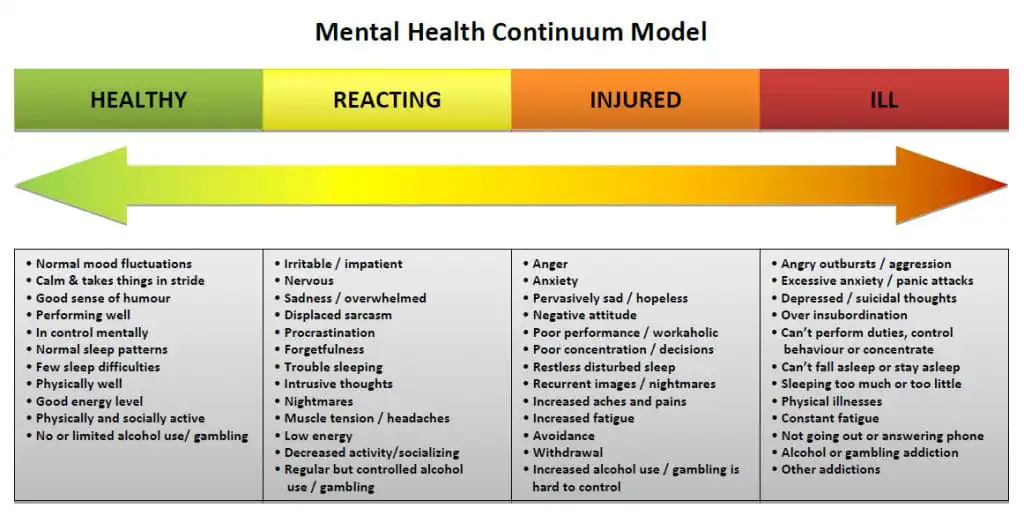We have to understand stress is not necessarily mental illness. We need a certain amount of it to perform at our peak abilities. There’s a very useful graphic called the Mental Health Continuum Model. It’s normal to fluctuate between green and yellow on a daily basis. When we can’t get back to the green spot for a couple of days — when we begin living between the yellow and orange zones — is when we get more concerned about being proactive in our own mental health. When we live in the yellow and orange zones, we are in danger of moving into that red zone. Everyone can recover — it does take a lot of self-care and reaching out to others — but a mental illness isn’t forever.