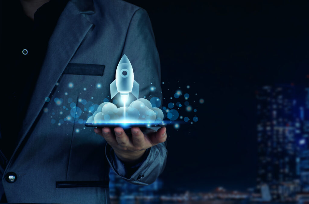 Startup business concept. Businessman holding a tablet, rocket launching and soar flying out from screen, starting a business, growing business, modern technology, hologram, network connection.