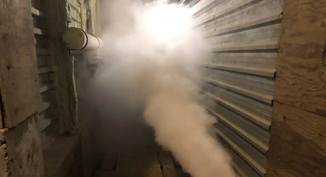 CIPC comes out of the treating pipe into the plenum while fogging a potato pile. Photo: Bill Orr