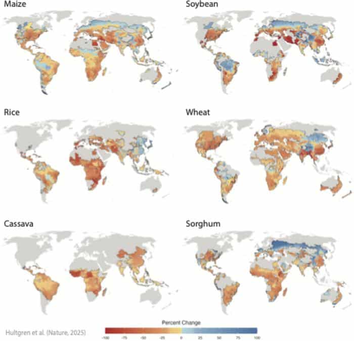 The study analyzes data from over 12,000 regions in 55 countries, focusing on the six crops that supply two-thirds of the world’s calories: wheat, corn, rice, soybeans, barley, and cassava, according to a press release.